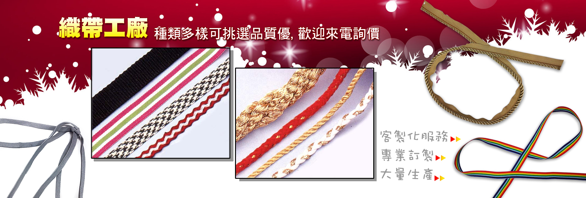 奕國企業有限公司在此業界擁有資歷豐富的經驗,所承製的系列產品織帶、棉織繩、金蔥鬆緊帶、特殊帶、寬緊帶、棉織帶、棉繩、繩子、識別證帶、水壺帶、手機頸帶、服飾輔料、鬆緊帶、特多龍鞋帶、螢光帶、金蔥帶螢光帶、金蔥帶、尼龍織帶、尼龍圓繩、行李背帶、帽帶、手提繩、繩索、中國結成衣副料都能確實達到市場需求,並且以品質獲得客戶的一致好評,若有任何疑問或是合作需求,歡迎與我們聯絡!